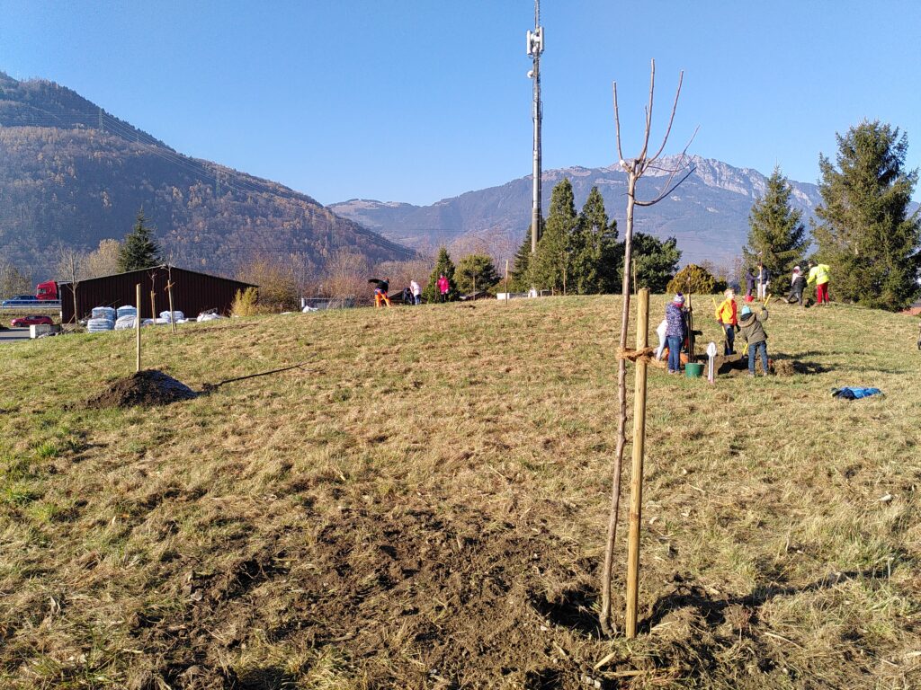 Ces derniers ont dû manier la pelle pour  remettre de la terre afin de faire tenir debout les tiges, tout en amendant de corne broyée. En milieu de matinée, un petit goûter offert les a requinqués pour pouvoir finir ces plantations. Le temps est vite passé et les échanges ont été enrichissants. Ils y retourneront au printemps pour observer l’évolution de leurs arbres.